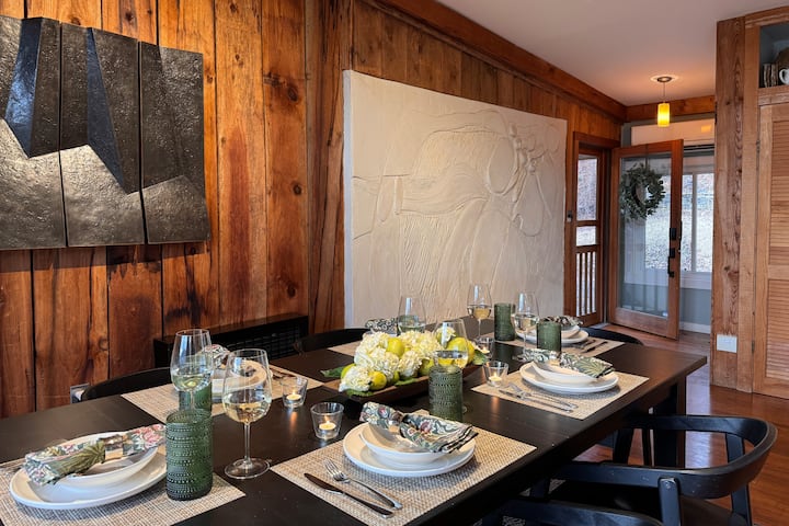 Designed by artists and just minutes from Penland School of Craft, Conley House is comfortable, elegant, unique. This modern cabin on 6 private acres features inspired art, majestic views, a chef’s kitchen, handmade tableware, two spacious master suites, art supplies and lightning-fast fiber internet—perfect for work or play. Bonus: a detached studio office/3rd bedroom makes the ultimate creative workspace or guest room.