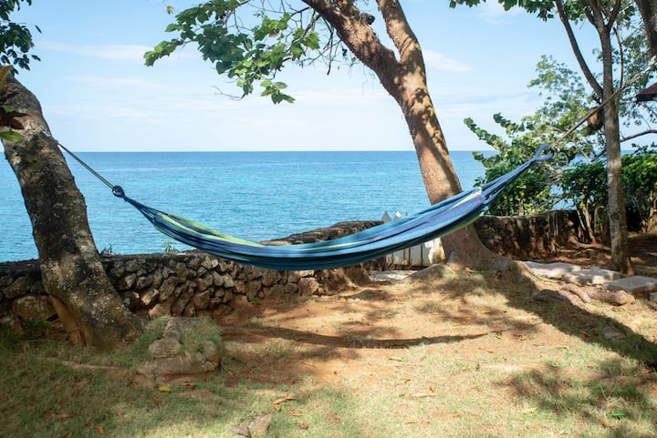 Garden: tropical trees, 2 hammocks and an oak framed gazebo with sofa and balustrade offering a breath-taking sea view.
