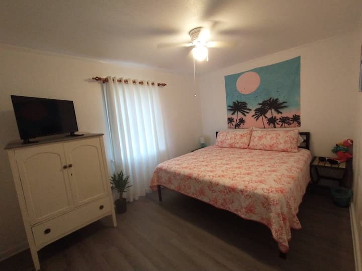Pineapple House is over 60 years old and, though greatly cared for, shows its age in some places. Expect to find some loving wear, quaint aging and charming patina both inside and outside. It is a block-built home, which was once the rage in Florida as they can generally withstand up to 250mph wind, though they don't tend to have the same aesthetic appeal as a traditional stick built home, therefore requiring a little more creativity with colors. :) The home boasts three bedrooms and one full bath. Two bedrooms have king beds and one has a full bed. One of the king beds is lower to the floor to make access easy and it is more firm, while the other king is taller and has an additional mattress pad making it very cushioned (some have said like sleeping on a cloud). The home has central heat and air conditioning, though the largest bedroom also has an additional wall AC unit to make it extra cold. The living room and bedrooms have TVs, though you will need to use your own login credentials for access to Prime, Netflix, Hulu, etc. We do have the Tubi app installed and The Roku Channel, which have news stations and movies available with no logon needed. No cable is provided. There is a washer and dryer in the home for your use, though you will need to supply your own detergent. There is a toaster and single serve Keurig coffee maker in the kitchen, as well as all of the typical pots/pans needed to make a home meal. Spare linens for the beds are in the linen closet when booking longer than 2 night stays, as well as bath/beach/hand towels and washcloths. The dining table can seat 4 and is located in the kitchen. The back porch is covered and has solar lights that automatically come on at dusk and stay lit for a reasonable amount of time typical for most people to sit out and enjoy. There are 5 chairs and a small table on the back porch. 5 minutes to downtown Pensacola and 15-20 minutes (depending on traffic) to Pensacola Beach. We hope you enjoy your stay.