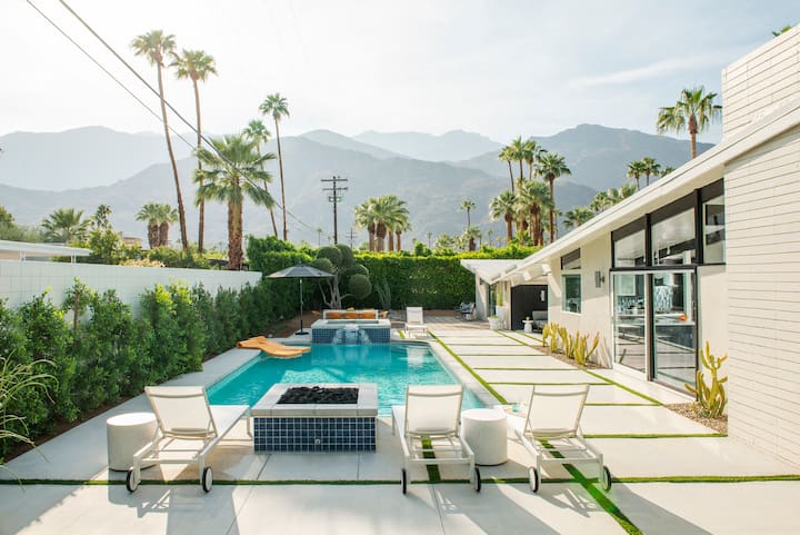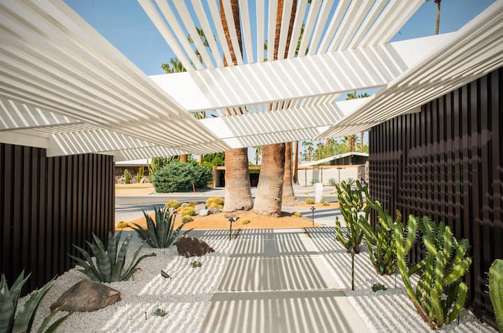 Palm Springs Butterfly. William Krisel designed, Alexander built butterfly roof beauty, lovingly restored in 2021. The current owners restored the home to its original design on the exterior while updating the interior to modern standards. The home now features 4 bedrooms and 3 full baths, view pool and spa, fire-feature, and all the luxury amenities you'd expect to find in a 5-star resort. Welcome to Twin Palms Butterfly! The home is approx. 2.4 miles from downtown the Twin Palms neighborhood.