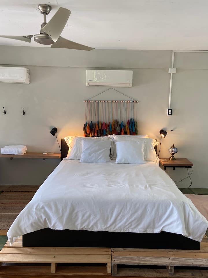 Beat the heat with the AC and ceiling fan.
