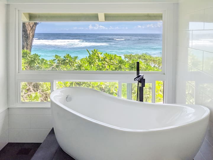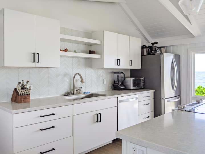 This modernized beach house features a newly renovated kitchen and full oceanfront bathroom with tub overlooking the tropical Hawaiian ocean. Featuring a stunning new kitchen with electric stove overlooking the Pacific, brand new stainless appliances, indoor / outdoor seating.