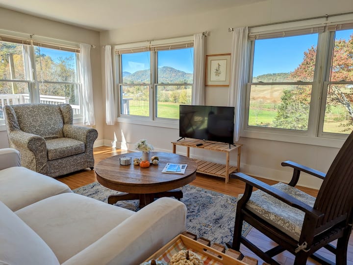 Our spacious, dog and family-friendly farmstay home features an abundance of windows to maximize the mountain views and sits in the middle of 35 acres of pasture, bordered by creeks and forest. There are large front and back decks, an outdoor propane grill and sheltered fire pit area. Sleeps 5.