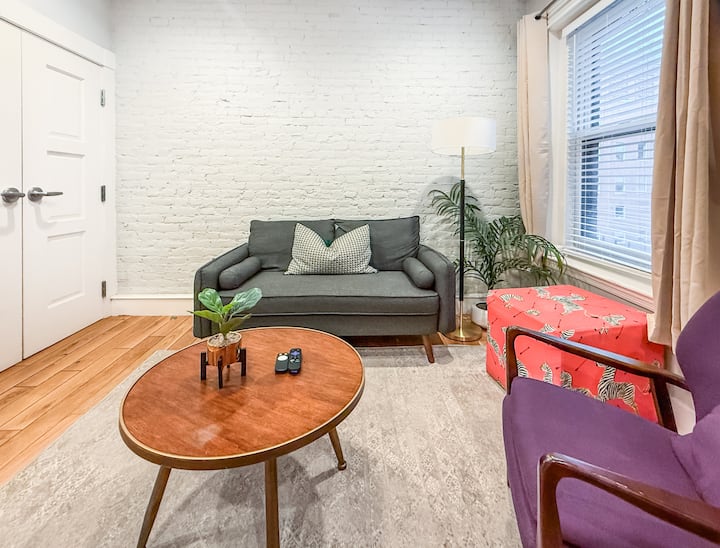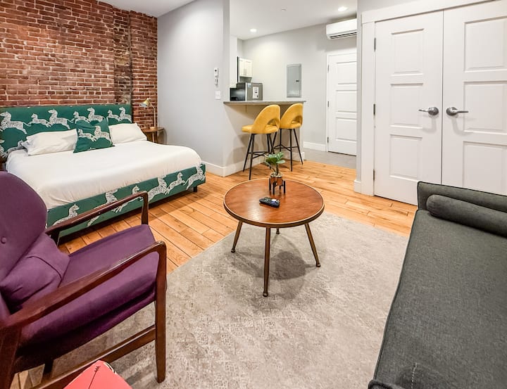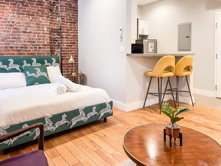 This thoughtfully styled studio features a queen-size bed with cotton linens, accented by an exposed brick wall and chic décor. A cozy couch, armchair, and coffee table create a relaxing lounge area, while a flat-screen TV with steaming capabilities lets you watch your favorite shows and movies. A built-in closet provides ample storage for longer stays.