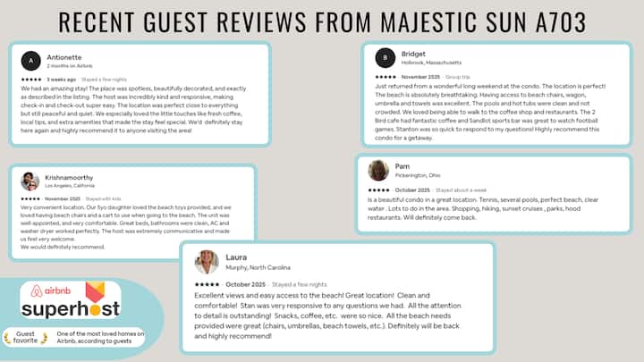 ✹My reviews across all my properties support that my #1 goal is delivering an awesome beach vacation for my guests. This starts with a sparkling clean condo and fast, excellent customer service. If you need anything at all, or if something is not right, I am quick to respond! I’ve tried to think of everything that my family and my guests would want in a beach rental. Vacation rentals are my passion, and I am always trying to improve the guest experience so suggestions are welcome!