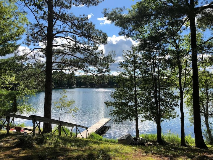 Quinn Cabin is a single story 806 square foot home on a private drive and on private, no-wake Log Lake in Kalkaska, Michigan. The property has plenty of room for parking in the large front yard, including space for a small boat or personal watercrafts, travel trailers or snowmobiles. There is also a large butterfly garden on the right side of the front yard. The backyard has a wide staircase that leads down to the lake- with solar lights to guide your way down to the dock during spring through fall evenings. Guests can enjoy 100 feet of private lake frontage for swimming, and using the provided paddle boat, two kayaks and row boat. The wooded property directly across the road from Quinn Cabin is ours so it's also available if you have little ones who love to look for toads, salamanders and caterpillars.