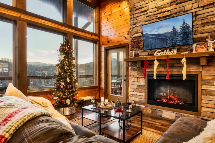Come enjoy the spectacular views at The Overlook where you will be surrounded by trees while relaxing in this luxurious newly built cabin. Cozy up with a warm beverage while streaming your favorite show in front of the fireplace or challenge companions to a game, there is plenty to keep everyone entertained. Featuring floor to ceiling windows on both levels and 4 unique patios you will enjoy the views both inside and out with an unobstructed view. You won't want to leave this beautiful space!