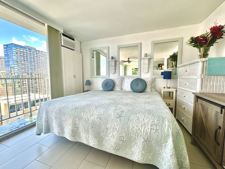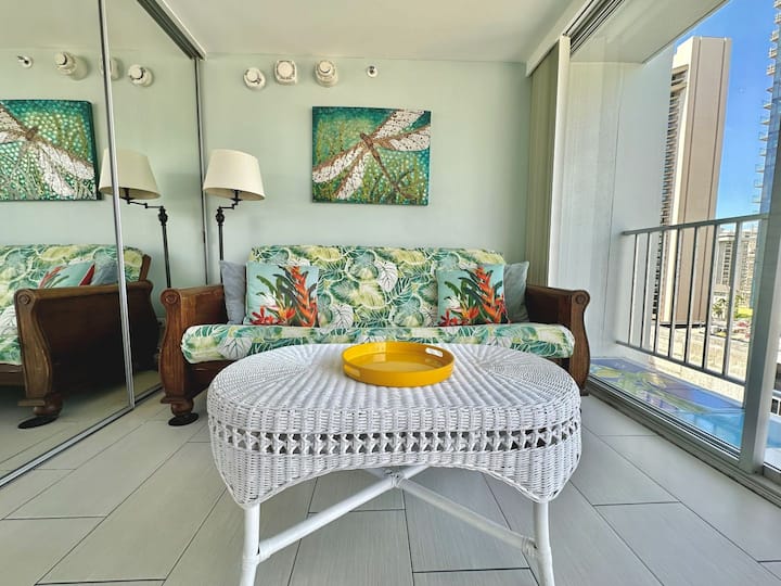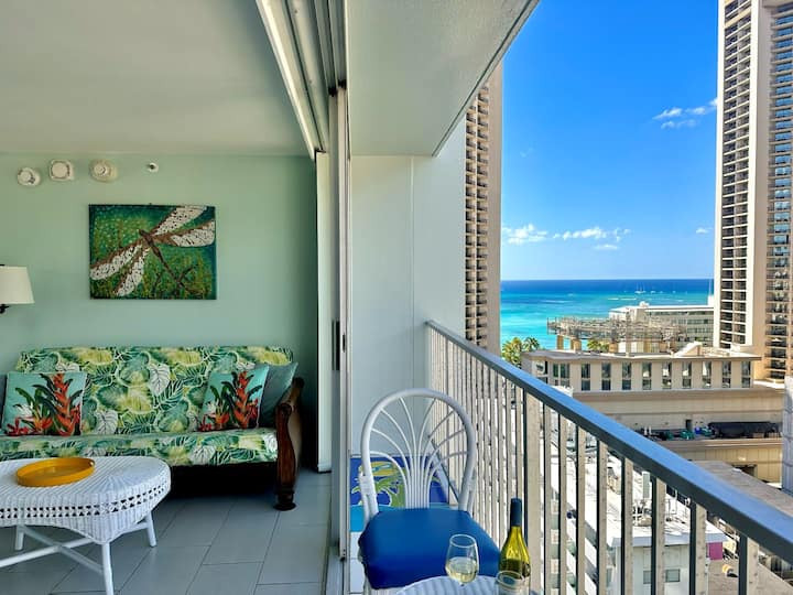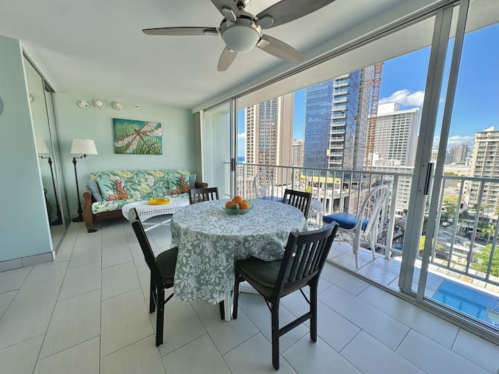 "HI TAT tax extra" Ask Deb" how to Make your trip more affordable at the updated “Pacific Monarch” just 700 steps to Waikiki Beach and Dukes Statue. No need to rent a car, pay for gas, insurance, or parking. Our large studio is not just a bed and a TV. Save on meals, beverages & “tips”, from your own ocean view lanai and equipped kitchen, or grill your own at our BBQ’s on the highest rooftop pool deck with 360 degree ocean, mountain and city views and stunning sunsets while you swim or hot tub.