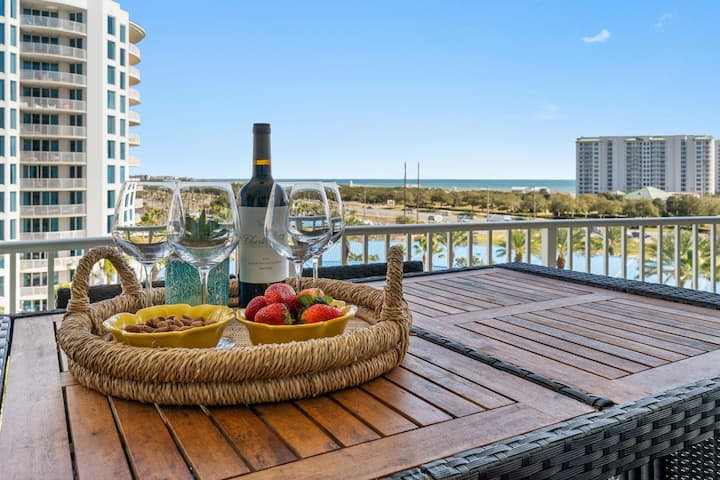 Large Balcony with high top Table and 6 seats, with pool and gulf views. 2 Large Bdrms w/ Luxury King Beds, both Bdrms have balcony access.