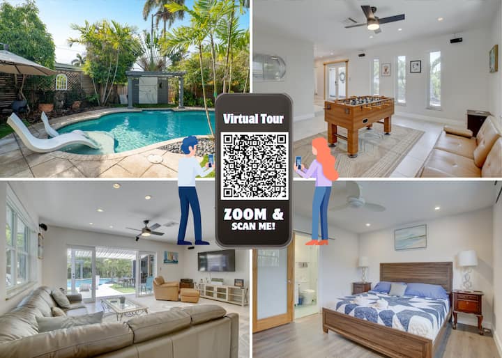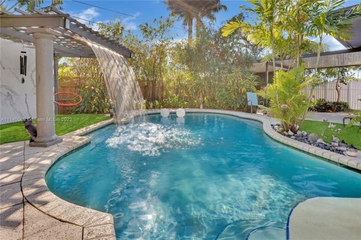 Indulge in a getaway at this stunning vacation home, featuring an architecturally landscaped design, a heated pool, a charming TV patio area, and a one-of-a-kind grotto-style outdoor shower. Minutes to Hollywood and a short drive to Fort Lauderdale and Miami Beach, you'll have easy access to the top attractions of South Florida. The Hollywood Beach Boardwalk is just a mile away, and hassle-free transportation options to and from FTL Airport add to the convenience of this idyllic retreat.