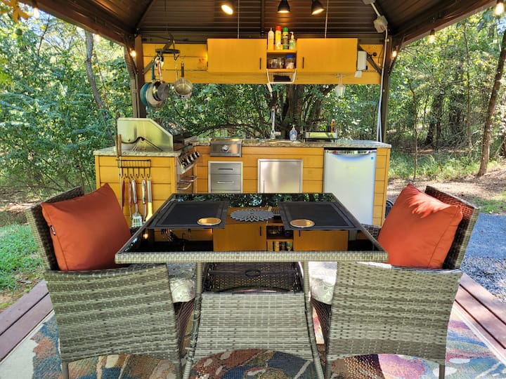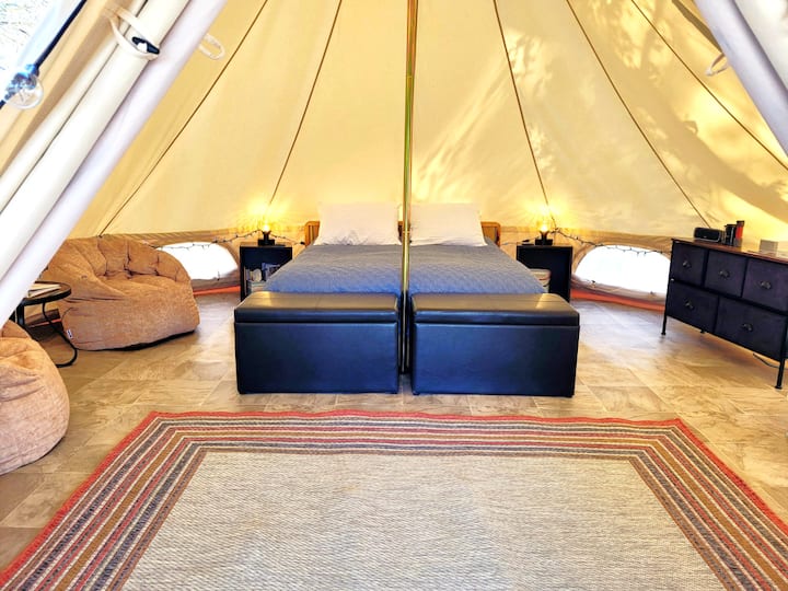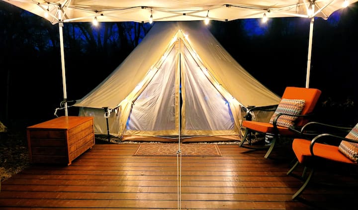The camp is fully equipped with an American-made, seasonally heated and air conditioned canvas bell tent, a real queen-sized platform bed, and layers of comfortable bedding for a restful night's sleep. Relax on the covered patio in rocking chairs or enjoy a meal at the outdoor kitchen and dining area. Don't forget to take a swing or lounge in the 2-person hammock while gazing at the beautiful natural surroundings. And, of course, every campsite needs a fire-ring and outdoor kitchen with gas grill for an elevated outdoor dining experience.