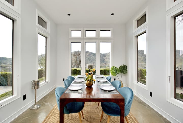 The high-ceiling, open-concept chef's kitchen welcomes guests to gather and create. The gas stove, stainless Gaggenau double ovens, and Nespresso machine beckons cooks for an evening's creation, while friends spectate with a glass of wine from the bar seating. The chic, adjoining breakfast area seats 4. Splendid, glass-walled formal dining room seats 8 guests and enjoys incredible views over the hills and lake. Thoughtful details such as a champagne stand and stylish serving dishes make hosting a dream.