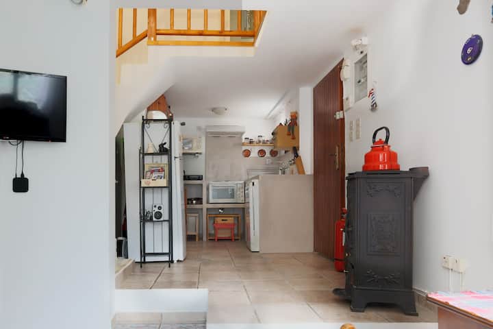 This beautifully decorated and cosy two storey studio, has a sunny living room with TV and fully equipped kitchen (oven, fridge, coffee machine, toaster, kettle, pots and pans, cutlery etc.) on the ground floor, and a bedroom with a comfy double bed and spacious wardrobe, as well as a modern bathroom on the upper level. Needless to say there is hot water the whole day and a quick wi fi network. The studio is perfect for a couple, but can also easily can accommodate four people, as its sofa in the living room can be used as beds.