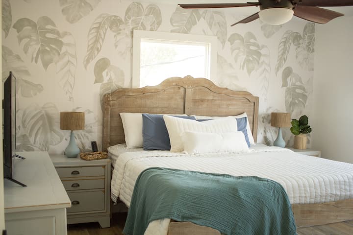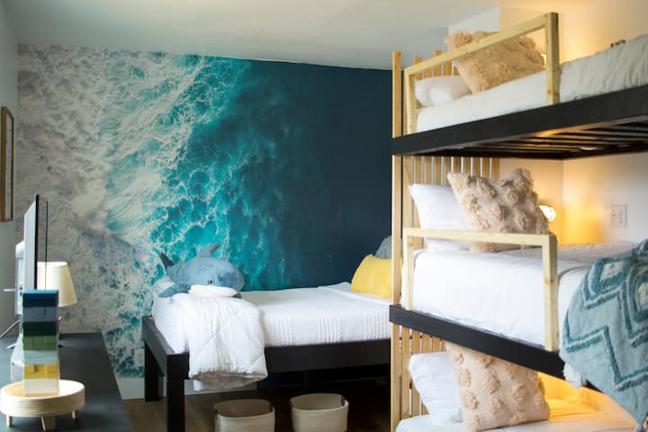 Each room has a unique spin on a beach home feel that incorporates The Sunset Surf vibes to help you unwind and connect. You will find two rooms with a king bed and their own exterior door, one room with a queen, and two bunk rooms. Each bunk room features one full bed and a triple twin bunk bed. Premium memory foam mattresses are throughout the home with sheets, a coverlet, a comforter, and two pillows per guest. Next to the beds, you will find a nightstand complete with reading light & in the bunks, shelves, plug-ins for your devices, and an individual light for your convenience on a switch (all outlets in bunks have child-proof protectors to ease all your worries mama). In each room you will find a ceiling fan or stand fan for your comfort needs.