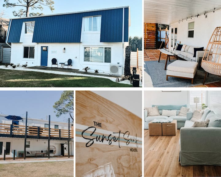Welcome to The Sunset Surf House, a modern coastal retreat on the quiet east end of PCB — just a 5-minute walk to sand.