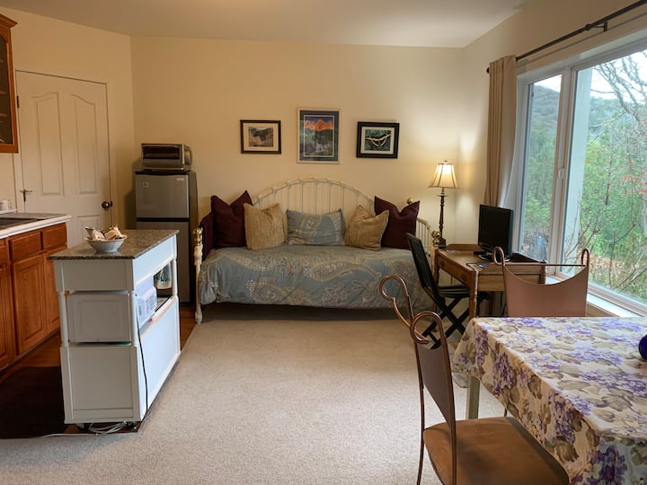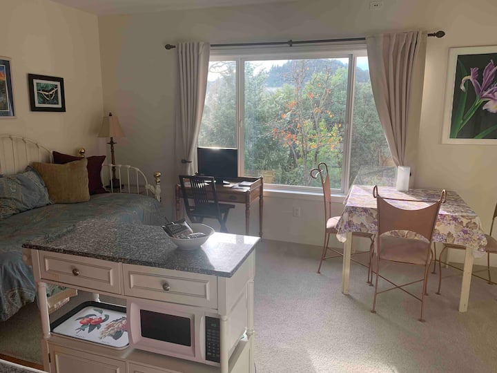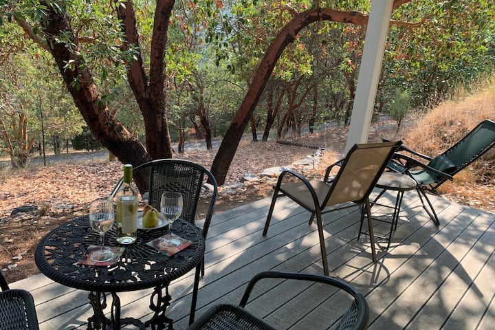 This comfortably furnished, private entry guest suite with huge windows and its own driveway, resides in the lower level of my house on a hill. It consists of one bedroom, one bath and a Great Room area with Kitchenette which includes an induction hotplate, coffee maker, French press, toaster oven, hot water kettle, microwave and a compact 4.5 cu. ft. refrigerator with cookware basics for meal preparation, see photos. This suite also features a daybed in the Great Room to sleep another person. To further enjoy the views, experience lounging on the huge private covered porch while barbecuing on a George Foreman grill. This is a special quiet sanctuary place where deer, turkey and birds abound. You can stay here, get away from it all, recuperate, de-stress and discover your true self among the nature trails and find your own peaceful meditation spot. Gaze at the zillions of stars at night. A full moon night is extraordinary. Commune with nature. De-stress in the massage chair, release what no longer serves you and melt into bliss with a sound healing session, or just unwind on the porch, read and sip a beverage. It is a smoke free environment with easily operable windows, no chemical cleansers or air fresheners used and some organic cotton sheets on beds. A Hepa air purifier comes in the unit along with an essential oil diffuser with lavender oil. There is a comfy queen size bed with memory foam topper in the large bedroom and a twin size day bed in the Great Room area accommodating a maximum of 3 people in the suite. Black out curtains are on all the windows if you like sleeping in. The elevation here is 2,200 feet it is several degrees cooler in the summer and it's above the fog that lies in the valley in the winter. The town of Jacksonville still lies in the fog belt 3 miles down the hill. It's sunnier up here in winter. Many hiking trail options nearby and minutes from Woodrat mountain. The large covered porch is shaded and cool most of the time. And an electric grill is there to use all year round. It's like Ireland in winter (wet season) and South of France in summer. Appropriately nicknamed “Little Napa”. Gorgeous all year. There is a central air heat pump with air conditioning for summer, supplemental electric wall heater for this suite and an air purifier for occasional smokey days in fire season. Find peace and rejuvenation here at the sanctuary.