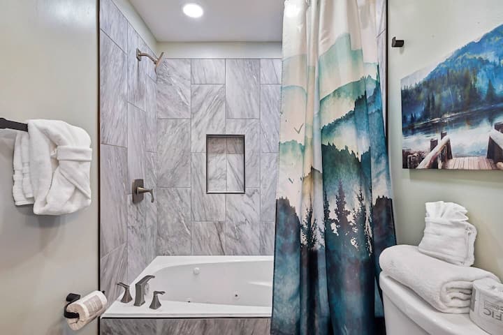 Kick your shoes off and soak in that mountain cabin vibe at the Cozy Blue Cottage, a spacious and inviting home in Gatlinburg, TN with a large private 7-person hot tub, beautiful back deck, and multiple bedrooms with ensuite baths. This home is in a great location 5 minutes from downtown and is perfectly suited for a multi-generation family adventure. Everyone from the grandparents to the kids will find something to love about our cottage (like the authentic arcade video game and single-level)