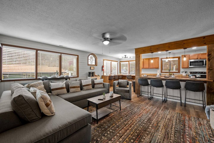 The huge, open floor plan living/family room is truly the heart of this home. Snuggle in on the West Elm sectional sofa for epic movie nights on the 65” Smart TV, or stretch out with a book (or perhaps a nap?) for the ideal lazy afternoon. The décor has the ambiance of an upscale mountain cabin and is sure to give you all the cozy feels! The room is uniquely surrounded by windows on two sides, which lets in the lovely crisp mountain light.