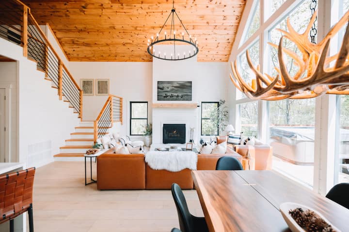 Welcome to The Everwoods Lodge: A mountain-modern, one-of-a kind cabin with breathtaking views, an outdoor Scandinavian barrel sauna, large hot tub, relaxing fire pit area + private hiking trails on property.