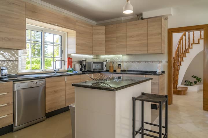 The kitchen is spacious, and fully equipped – with pots and pans, cutlery and china for 12. You will find a blender, coffee maker, oven, kettle, air fryer etc. available in this Villa, plus a kitchen island. The unit also has a large outdoor eating area near the BBQ. It also has a dishwasher, washing machine, tumble dryer, microwave, BBQ, etc.