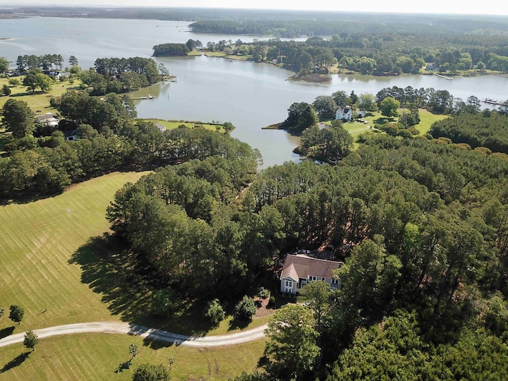 Our 6-acre waterfront getaway surrounds a secluded private cove with 1,000 feet of Chesapeake Bay waterfront and a fresh water pond. The 6-bedroom, 3-bathroom home comes with complementary kayaks, canoe, standup paddle board and sports equipment. Property also features fire pit, fitness trail w/ yoga space, sunrise dock, swimming, hot tub, kids treehouse, volleyball, movie theater, fenced in yard & more.