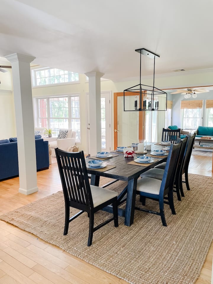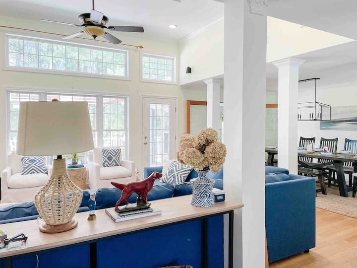The living room is flanked on one side with full bay-facing windows and features a large comfy couch and sitting chairs facing the fireplace and 70" smart TV. Nearby the dining room features our large dining table with seating for up to 10. The nearby sunroom features three walls of windows facing the bay and backyard along with a gas fireplace, comfy couch, sitting chairs and a 4-person card table.