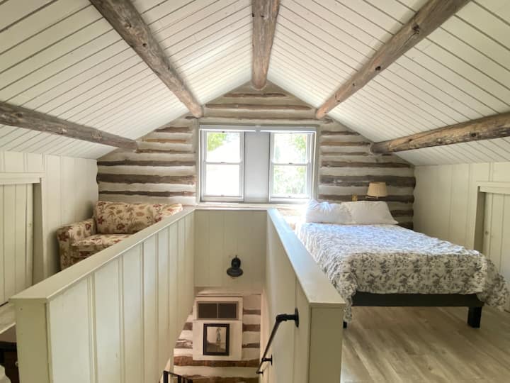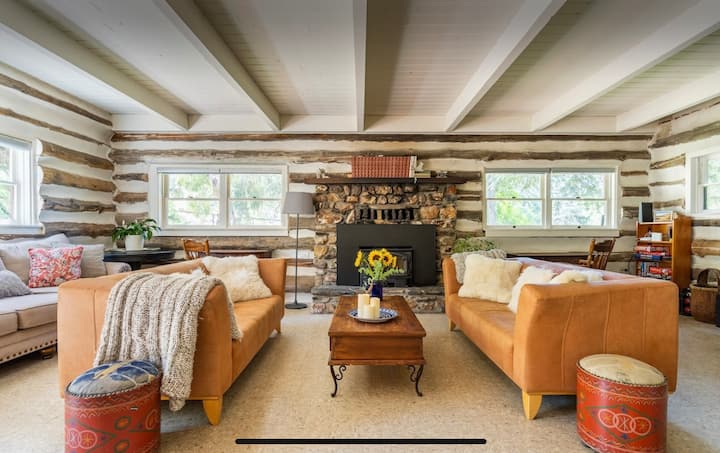 This charming house exudes authenticity, with its log cabin walls and a stacked stone fireplace.