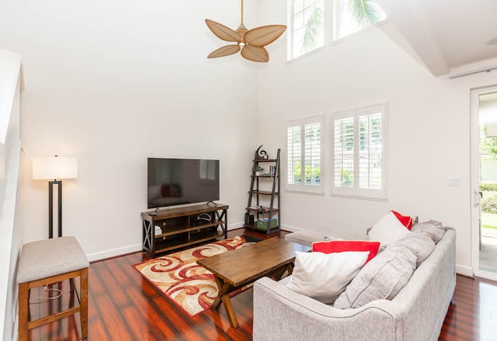 Welcome to your tropical haven in Ko Olina. This delightful 3-bed, 3-bath house is a prime location, just a short walk from the Ko Olina Lagoons! Tailored for both adults and families with children, this getaway provides beach supplies such as a surf board, snorkeling gear and fins, beach chairs, umbrellas, boogie boards, toys, and a beach wagon, ensuring unforgettable beach adventures. You'll also get access to a pool, barbecue grills, tennis courts, sports club and free fitness classes.