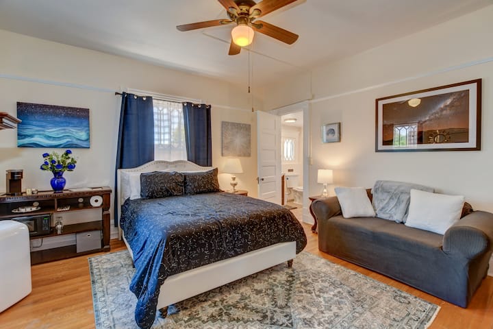Unit 6 - “The Rose Room” is upstairs on the 2nd level and is approx. 300 sq ft with 1 bed/1 bath. This space has 1 large-size bedroom with a queen-size bed, a loveseat couch, 39” TV, and a bathroom with a stand-up shower. This is the only unit that does not have a full kitchen but it does have a mini fridge and microwave for your use and enjoyment.