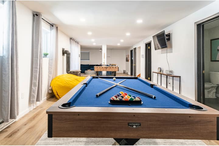 On the lower level you'll find the 4th bedroom with a twin over full bunk bed, another bathroom, media room with 120" projector, pool table, foosball table, TV, another propane fireplace, and board games. Outside the lower level through the sliding doors you'll find a 6-7 person hot tub, backyard fire pit with firewood provided, 4 burner propane grill on the deck, and other outdoor furnishings.