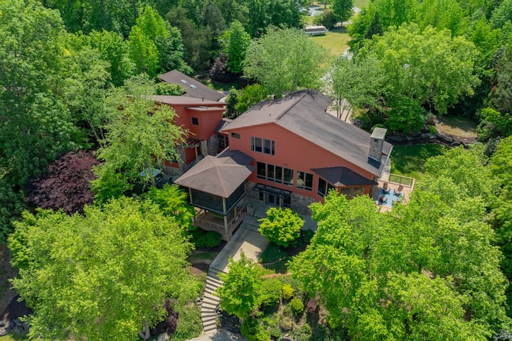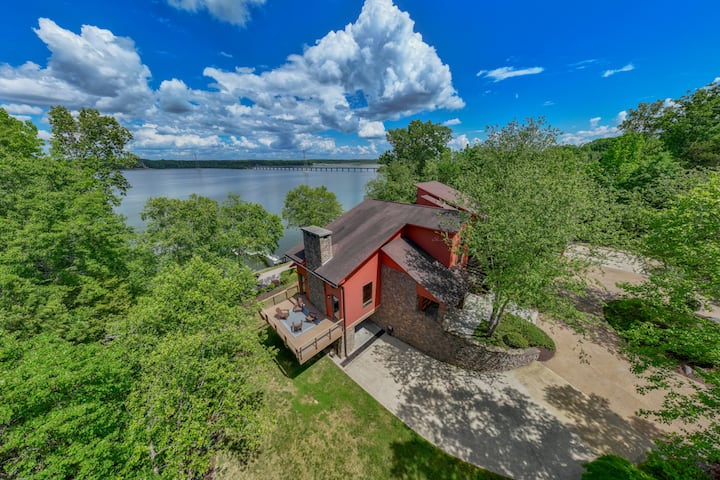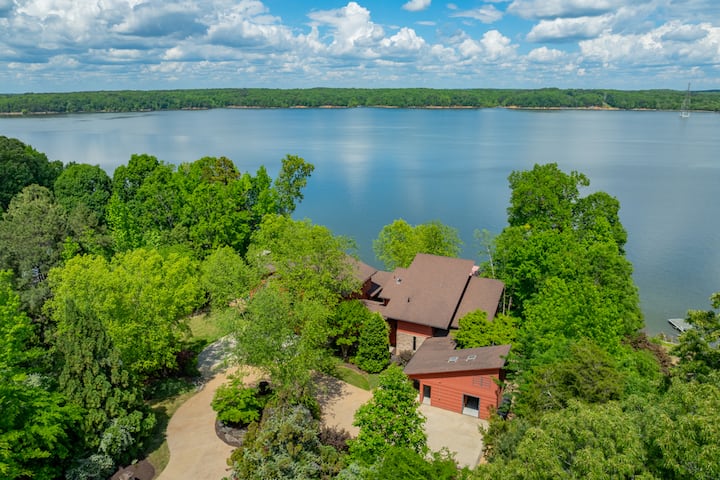 This unique custom-built 4,700 sq. ft. luxury lake house is located on the main Kerr Lake (water marker 21) just 1 mile from Downtown Clarksville, VA. The home offers fabulous views, a gorgeous back yard facing the lake, a boat dock, good water depth at the boathouse, and a hot tub. The outside boasts 3 balconies and 1 covered porch, a grill, and plenty of outside furniture. With 3 primary bedroom suites (all with newly renovated ensuite bathrooms and lake views), everyone is going to be happy!