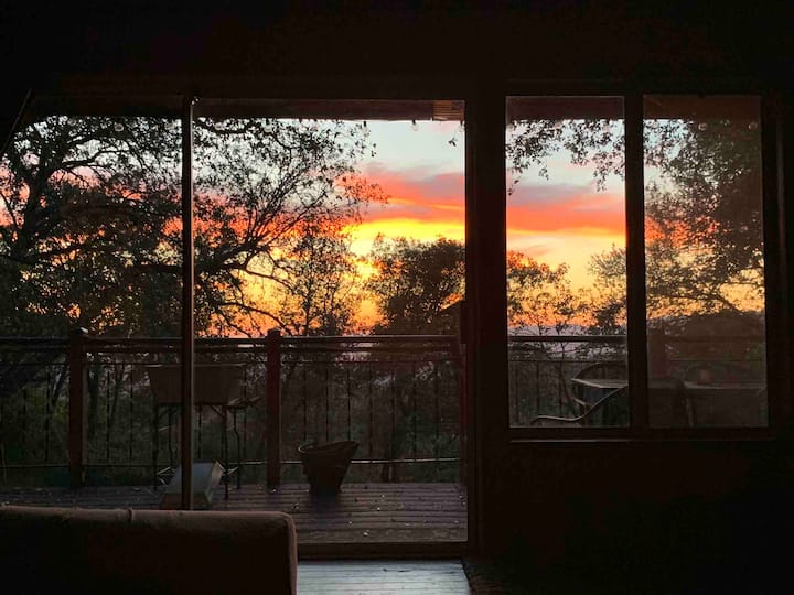 Turn-key cabin stocked with everything down to spices & kitchen pantry items, one that has items for traveling with your furry companions, essentials in the bathroom including stuff you may have forgotten, all the basics for traveling with baby or young kids, a dedicated play room for said kids, hang out by a fire pit with a bench the size of our deck under giant oak trees, a giant bird plank feeder for daily living room bird watching, deer and turkey from the windows, rope and tire swings for the kids, afternoon relaxation watching amazing sunsets from a westward facing balcony, then this IS the place for you.