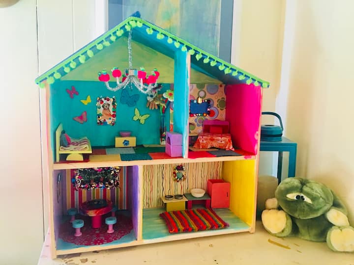 There is a dedicated kids' room with age-appropriate toys, a train table, farmers market stand with play food, kid-sized table and chairs, dollhouse, and a TV monitor with Apple TV and DVD player. I’m in the process of replacing the floors, the flooring at the stair landing is uneven bc I have the flooring under the carpet. Just be aware it’s uneven.