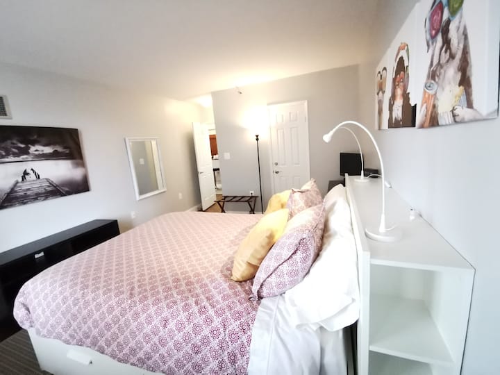 The bedroom has a small walk-in closet and a comfortable and cozy queen-size bed with a soft memory foam mattress. In addition, the living room has a sofa bed, if not all member of your party are intimately related. There is a small desk by the walk-in closet which includes an HDMI monitor and an LED lamp if working is in your cards while visiting town.