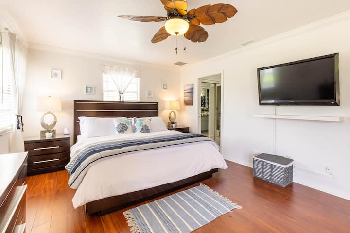 Master bedroom with comfortable King bed, coastal artwork, TV with fire stick(includes HULU), USB outlets,
