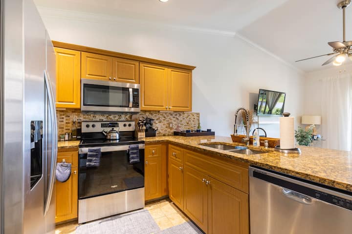 the bedrooms & tile floors in living area, coastal décor and upgraded kitchen with stainless steel appliances, cooking utensils, toaster, coffee maker and all you’ll need to make a great meal.