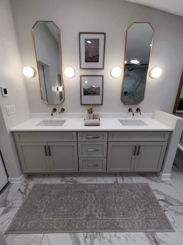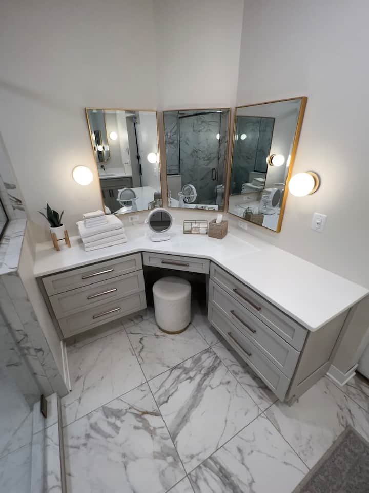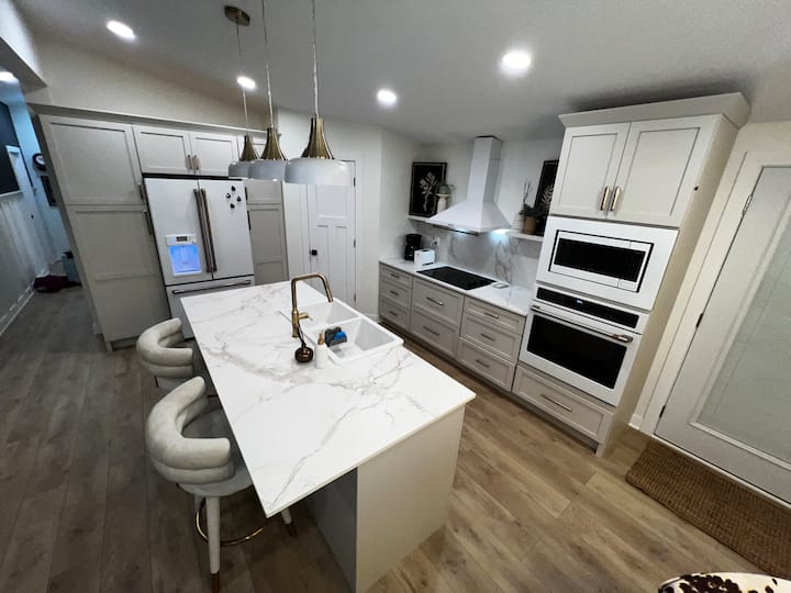 The open concept layout includes a full kitchen with all new GE Cafe appliances purchased in 2020, including a wall oven and microwave with wifi capabilities, a cooktop and range hood, a dishwasher, and a french door refrigerator/drawer freezer complete with a hot water dispenser. I also have a toaster, air fryer, blender, crockpot and coffee maker. You’ll find plenty of dinner and drinkware, pots & pans, utensils and an assortment of spices, condiments and dry goods such as flour, sugar, baking powder, etc. to use at your convenience. You’ll also find bonus snacks in the fridge, freezer and pantry drawers.