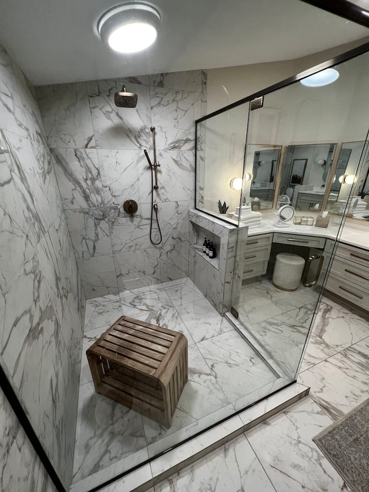 The bathroom is complete with a 74x60 shower, a 93” double sink vanity, a large seated makeup vanity with plenty of drawers for storage, a heated toilet seat, hot water bidet, and heated floors throughout.
