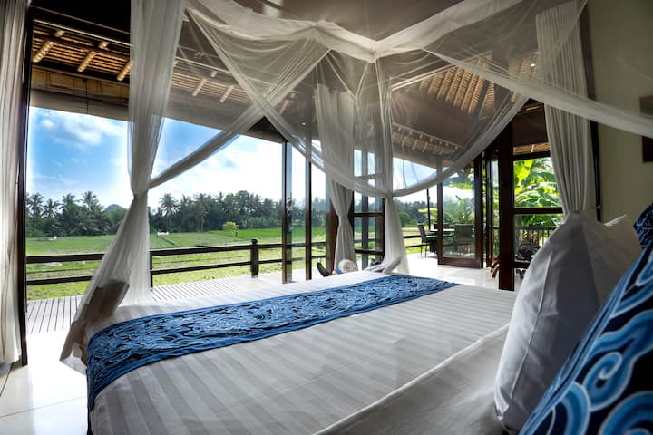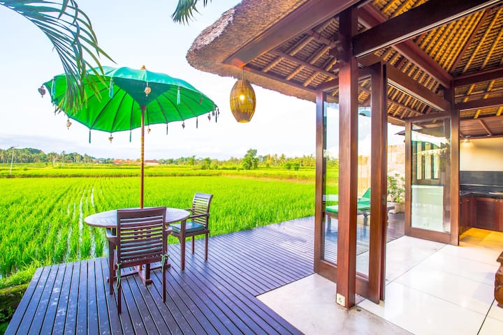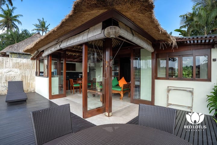 Created by artist and master builder Wayan, our 5 villas are a slice of peaceful heaven with the best view ever overlooking a huge rice field in Ubud's Lodtunduh village. We designed them in a modern tropical minimalist style to reflect a deep connection with the land and an environment in harmony with nature. No matter which villa you choose to stay in, we provide a superlative experience for guests so you can have an authentic Bali vacation and truly relax. We have a wonderful management and hospitality team (Ubud Red Lotus Management) to create a seamless experience for you from booking to arrival to departure.
