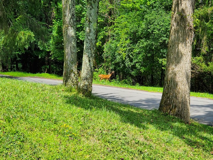 All bedrooms and the living room have televisions with Roku and ceiling fans. The living room also has a gas fireplace, very cozy in winter! The twin bedroom has a bladeless tower fan, great for kids! The other 3 bedrooms all have queen beds. All pillows are memory foam. The two main bedrooms and the living room have window air conditioners.