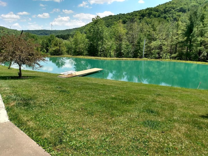 The porch allows you to enjoy the private setting and watch the birds and deer go in and out of the wooded area. Enjoy hiking trails on the property which allow for a nice afternoon walk. Enjoy some fishing for brook trout in the creek that runs through the property or take a dip in the creek. The nature lover of your crew is sure to love a getaway like this! Lots and lots of trails to enjoy, across the street you are welcome to swim in a beautiful pond.
