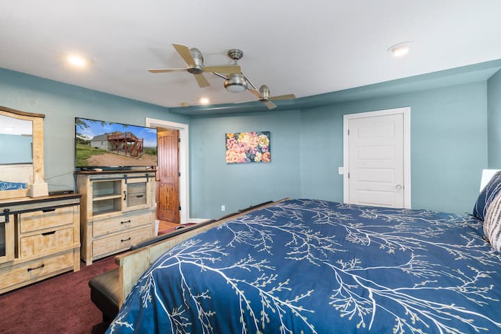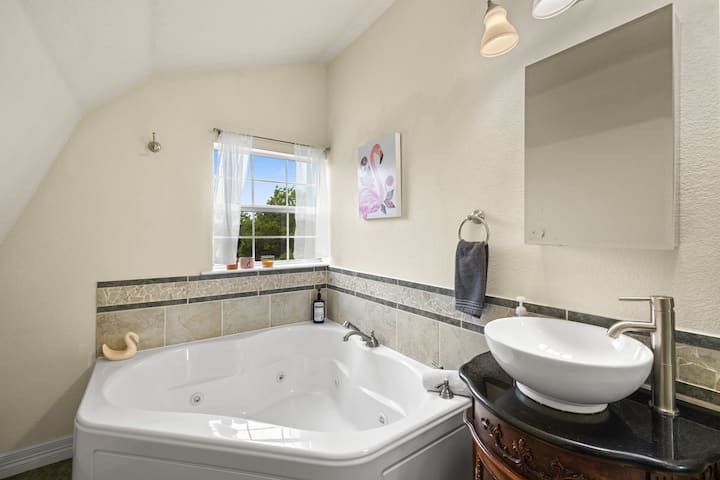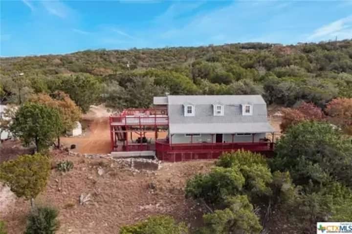 ENTIRE Home wooded scenic hilltop secluded 4 acres kingbeds, complimentary snacks, highspeed free Wi-Fi Smart TV with DVD Blu-ray Player & DVDs, washer/dryer/full kitchen, jacuzzi, firepit, covered porch4small dogs, large upstair & downstair patio dining area w/hilltop scenic view, free parking, ideal for family getaways, home office, camping, hiking, 4 min to Turkey Bend canoeing/kayaking, swimming, fishing, camping, minutes to Balcones wildlife refuge, Caverns Vanishing TX River Cruise Zipline