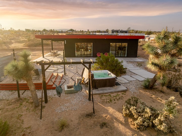 👽Star-Gazing Comfort: The backyard also includes a fire pit and sectional where you can cozy up, while the front yard also has a traditional desert cowboy tub, and a pergola with hanging hammock chairs in front of another fire pit for comfortable, classic Joshua Tree stargazing under the ambient string lights.