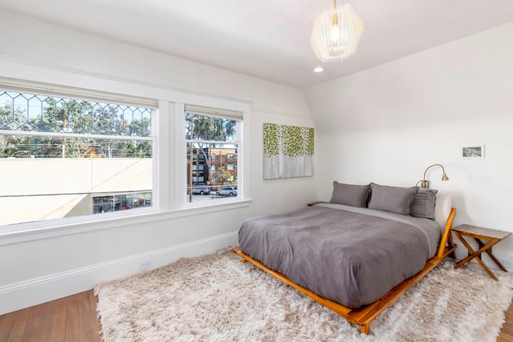 This home comfortably sleeps 8 guests across 4 bedrooms and 3.5 bathrooms. The upper floor includes a serene queen suite with an en suite bath, a full-size bedroom with a private balcony overlooking the garden, and a twin trundle room ideal for children or friends. On the main level, a private studio offers a sofa bed, TV, private entrance, and bathroom access - perfect for added privacy or a workspace.