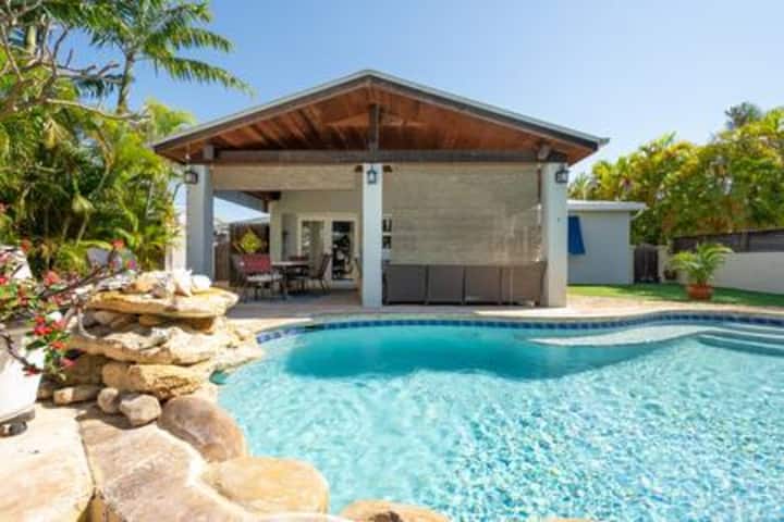 Pool & Waterfall: The centerpiece of this outdoor haven is an exquisite heated pool that features a cascading waterfall. The soothing sound of water complements the soft breeze coming from the waterway, enhancing the tranquil atmosphere. The pool's design is perfect for both for children playing and adults enjoying a cocktail.