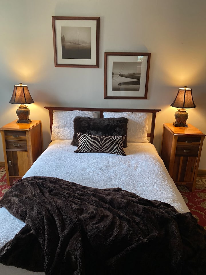 Our two-level cottage features charming, narrow stairs leading to the second floor, where you’ll find two cozy bedrooms: