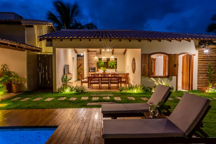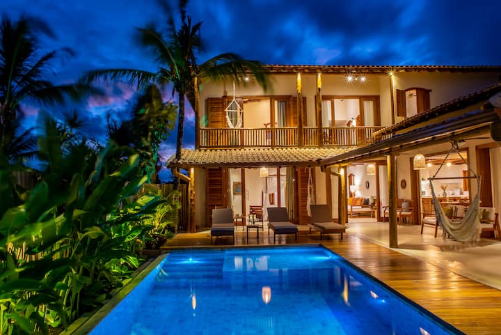 Welcome to Villa Marfim in Arraial d'Ajuda, a high-end, spacious, very charming and exclusive villa, with a privileged location: a few steps from the best restaurants on Rua Mucugê and beautiful beaches. Inspired by Mediterranean architecture, it has more than 500 m2 of built area, 6 spacious en-suites, a private pool, an American-style kitchen, a gourmet area, balconies, gardens and a garage. Villa Marfim is a true oasis for creating special moments with family and friends.