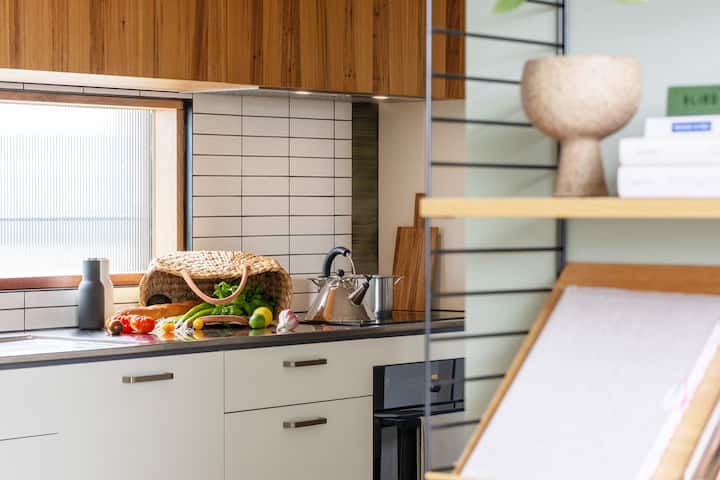 The light filled kitchen comprises all-electric appliances, including an all-electric induction cooktop, oven and dishwasher all made by premium Swiss appliance manufacturer V-ZUG. The space is fully appointed by Robert Gordon pottery and MAKE Designed Objects, with a comprehensive set of cookware and utensils from Scanpan, Alessi and Bialetti to Joseph Joseph. We encourage you to use the kitchen during your stay, making use of our cookbooks to inspire and filling the market bag provided to the brim with goodies from the local market.