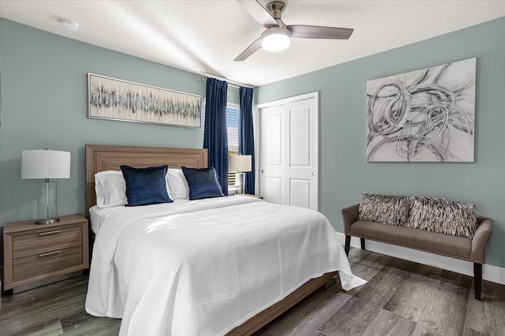 Blue King Primary Bedroom- King bed with ensuite and tv.