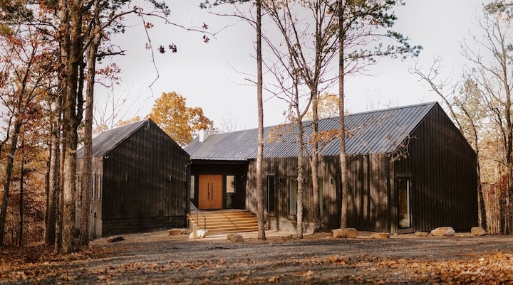 Escape to a one-of-a-kind luxury treehouse cabin nestled on 3 wooded acres in Broken Bow. This modern retreat sleeps 8 with 2 king suites, a bunk room, and an open-concept living area. Floor-to-ceiling windows, designer finishes, a gourmet kitchen, hot tub, outdoor fireplace, and fire pit make it perfect for relaxation. Enjoy private decks, serene forest views, and a Tesla charging station. Ideal for families, couples, or friends seeking privacy and luxury.